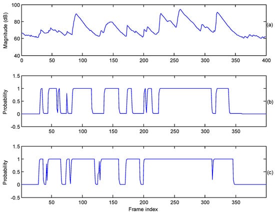 Figure 2 presents the comparisons of estimated probability of speech-presence. The values of the speech-presence probability in the proposed method (Figure 2c) are higher than that of the MCRA method shown in Figure 2b during the offset and onset of vowels. Moreover, the consonants of an utterance also can have the value of the speech-presence probability approaching unity. This is attributed to the thresholds of speech presence being reduced for a vowel and its neighbor frames as given in (17), enabling the speech spectra to be preserved by the process of speech denoising. The quality of denoised speech using the MCRA noise estimator improves. Conversely, the threshold is set to a high level during noise-dominant regions, enabling interference noise to be accurately classified as noise, i.e., the corresponding values of speech presence probability approaching zero, in particular at the beginning and ending of the utterance shown in Figure 2c.