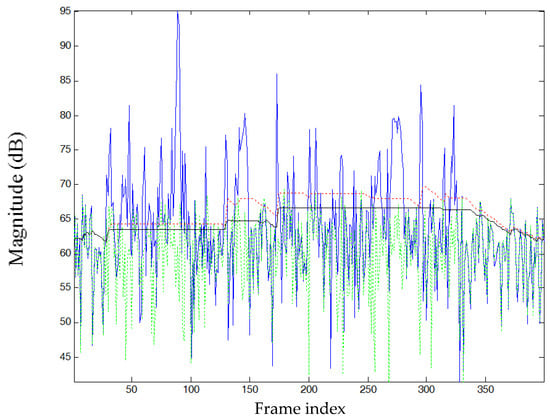 In the case of non-stationary noise interference, such as factory noise, the proposed method also performs well in noise estimation shown in Figure 4. By comparing the estimated magnitude of noise contours for the MCRA and proposed methods, the level of the proposed method is lower than that of the MCRA method during vowel regions. This ensures that the speech components with weak energy are preserved by the process of speech denoising. On the contrary, the levels of noise estimate for the proposed method are not less than that obtained by the MCRA method during noise-dominated regions. Accordingly, the proposed method still can well track noise magnitude at non-stationary noise interference environments.