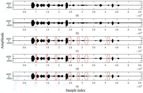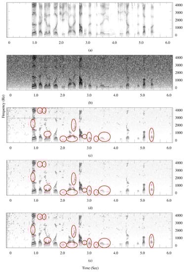By observing Figure 6, a speech signal is corrupted by factory noise as shown in Figure 6b. Factory noise is non-stationary. It is a challenge to remove this noise interference noise in noisy speech. By comparing the denoised speech shown in Figure 6c–e, the proposed approach (Figure 6e) is better to preserve speech components for weak vowels and consonants marked by ellipses. Accordingly, the proposed method can improve the performance of the MCRA noise estimator by the preservation of weak speech components.