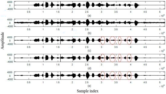 Figure 5 and Figure 6 demonstrate two examples of waveform plots for performance comparisons. Speech signals uttered by a male and a female speaker were interfered by helicopter-cockpit and factory noise with Avg_SegSNR = 5 dB. In Figure 5c–e and Figure 6c–e, a clipped signal is absent at the output waveforms of the denoised speech. This is attributed to all noise estimators that do not over-estimate the level of noise power spectra for each sub-band, yielding denoised speech not suffering from serious speech distortion. By comparing Figure 5c–e, interference noise can be effectively removed by using the three noise estimators for speech denoising. The proposed method can preserve a greater quantity of speech components than the other two methods during speech presence regions, including weak vowels, the onset and offset of a vowel, and consonants marked by ellipses. This is due to the adaptation of harmonic properties for the determination of segment length and the thresholds for speech presence as given in (5) and (17).