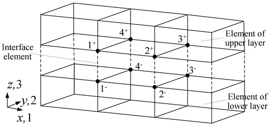 In this approach, a zero-thickness cohesive interface element was introduced into the finite element computations for composite materials. The zero-thickness means that the geometric thickness of cohesive elements is equal to zero, and not the constitutive thickness. Since the initial geometric thickness of the interface element is zero, the deformation state of the zero-thickness element cannot be described by the classical definition of strain. Instead, the constitutive response of the zero-thickness interface element is established in terms of a linear elastic traction-separation description. In general, the available traction-separation model consists of three parts: linear elastic traction-separation; damage initiation criteria; and damage evolution laws [34,35]. However, only initially linear elastic behavior is considered due to stress distribution being the only concern in this paper.
