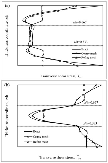 The interlaminar stresses analyses were performed using the commercial FE code, Abaqus (Version 6.11, Dassault Systemes Simulia Corp., Providence, RI, USA, 2011). A 3D 8-node linear brick, with an incompatible modes element, was used to model the ply. The interface element based on the linear traction-separation description was introduced into two adjacent plies. This constitutive response is readily available in Abaqus and therefore does not require user-defined subroutines. This 3D FE model is generated using uniform meshes, where the in-plane mesh consisted of 30 × 30 elements. For comparison purposes, two kinds of mesh density in the thickness directions are considered, namely coarse mesh and fine mesh, respectively. For the case, a = 3 mm, S = 4, the former of which is just one element for each ply in the thickness direction, and the latter of which indicates four elements for each ply. According to the recommended rage of the interface stiffness by Reference [38], K is taken as 5 × 106 N/mm3. The distribution of various non-dimensionalized stresses , respectively, through the thickness of the plate at the position where each stress attained a maximum is shown in Figure 3. In this procedure, the interlaminar stresses were calculated by the interface element, which used the traction-separation description. The transverse stresses in layers were analyzed based on 3D elasticity and extrapolated from the element integration point.