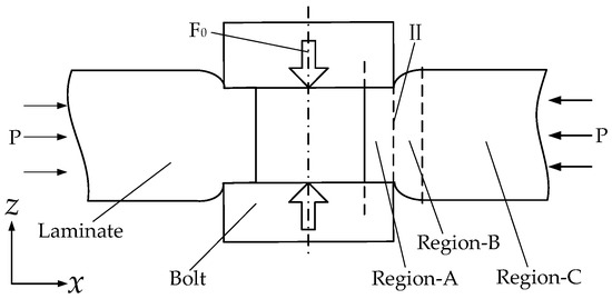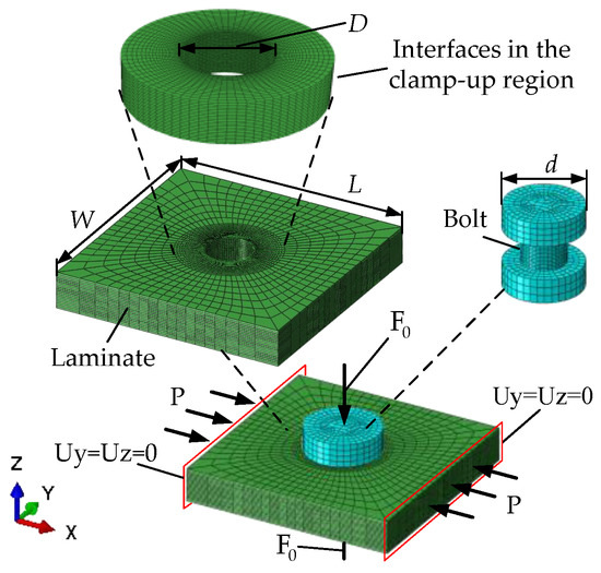 The Coulomb friction model was adopted for the contact between the laminate and the bolt. Based on previous investigations [40], the friction coefficients between bolt shank and laminate is μ = 0.1, and between bolt head and laminate is μ = 0.43. The boundary and loading conditions are also shown in Figure 5. The in-plane surface traction load P = 100 N/mm2 are applied to the both ends of the model. The bolt load is defined in terms of a concentrated force, and different pre-load F0 are applied on the bolt.