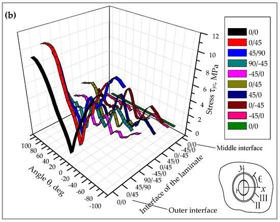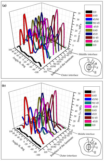Interlaminar shear stress distributions around Position I: (a) ; (b) . Outer interface—The interfaces located outside the filled-hole laminate, such as the 0/0 and 0/45 interface. Middle interface—The interfaces near the symmetry plane of laminate, such as the −45/0 and 0/0 interface.