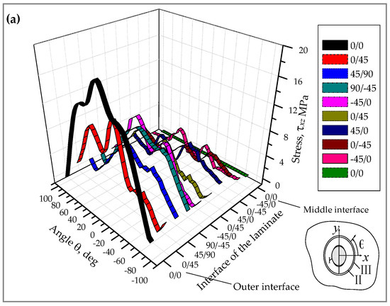The interlaminar shear stress distributions curve at Position III is shown in Figure 8. As seen in Figure 8a, the magnitude of in the outer interface of the laminate is higher than that of the middle interfaces at Position III, except near θ = 90° and −90°, and there is a decrease in thickness direction from outside to inside. shows a similar tendency excepted near θ = 0°. A larger magnitude of the interlaminar shear stress is also exhibited at the 0/45 interface. Therefore, the maximum value of or at the outer 0/0 and 0/45 interfaces are much higher than those of the middle −45/0 and 0/0 interfaces. It is interesting to note that, at Position I (Figure 7), regardless of whether it is the outer interface or the middle, large interlaminar shear stresses at the 0/45 interface and small interlaminar shear stresses at 0/0 interface are found. However, at Position III, the magnitude of interlaminar stresses appears to have little relation to the elastic properties of adjacent layers and exhibit a higher value at the outer interfaces.