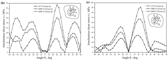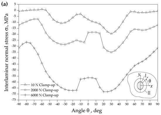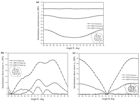 - With the increase in clamp-up load, both interlaminar normal stress (Figure 10a) and interlaminar shear stresses (Figure 10b,c) increase in most of the circular region. This is different from the interlaminar stress distributions in the laminate at Position I. At Position III, the phenomenon of the interlaminar shear stress reduction does not appear with the increase in clamp-up load. In contrast, shear stress increases with the increase of the clamping force.