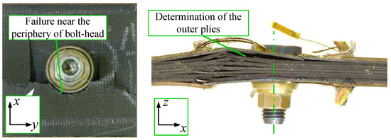 Interlaminar stresses exist within the laminate that cannot be directly measured by experiment. As an alternative, the interlaminar stress distribution characteristics of filled-hole compression tests can be identified by the failure mode. Castanie et al. [16] analyzed failure modes occurring during the filled-hole compression (FHC) test, and observed that the crack initiated at the periphery of the bolt with a little off-set from the net section for high 0° oriented lay-ups, and the final failure mode was a static failure of the outer ply oriented at 0° (Figure 11). They also supposed that the reason for this phenomenon was that the tightening modified the local triaxial stress concentration and load transfer between the hole and the bolt. The interlaminar stress distributions trend in the filled-hole laminate near the hole that was obtained in this paper is in accordance with Castanie’s inference. The numerical analysis in this paper shows that the tightened bolt does change the interlaminar stress distribution state in the filled-hole laminate, and both Position I and Position II exhibit interlaminar stress concentration. Furthermore, the numerical analysis also shows that initial clamping forces can improve the interlaminar stress distribution state at Position I. However, the bolt clamping force did not make the interlaminar stress distribution better in the laminate near Position II, according to the following two inferences made in this paper. First, the interlaminar shear stresses near Position II increased with an increase in the clamp-up load. Second, the compressive interlaminar normal stress and the interlaminar shear stresses are not at the same circular position. These interlaminar stress distribution characteristics may induce delamination in composite joints, and the delamination position may be initiated near the bolt head prior to the hole edge, which leads to ultimate delamination failure modes offset from center of hole.