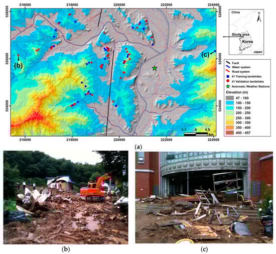 Digital elevation model (DEM) and landslide occurrences in the study area: (a) collapsed houses; (b) building; and (c) debris flows in Neungwonri and Hankuk University of Foreign Studies located in Figure 1a, respectively.