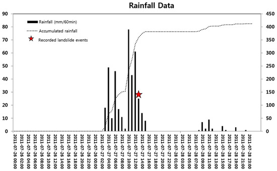 Rainfall affects the slope stability by means of its influence on run-off and pore water pressure [32]. Specifically, high intensity rainfall usually relates to a high concentration of landslide events in time and space [33]. In this study, rainfall characteristics were analyzed over the period 26–28 July 2011, which affected landslide occurrences. Hourly rainfall data were collected from one automatic weather station (AWS) in the study area (Figure 2). Figure 2 shows the amount of hourly rainfall and its accumulative rainfall. It was reported in articles that the landslides occurred around 1:00 p.m. on 27 July 2011. Before the landslide event, the rain fell for 10 h from 3:00 a.m. that day. The highest hourly rainfall recorded was 78 mm at 10:00 a.m. The second highest recorded hourly rainfall was 68 mm at 12:00 a.m. before the landslide events at 1:00 p.m. The volume of rainfall accumulation at the time of the landslide events was recorded at 385 mm in the study area. The different seven AWS sites outside the study area showed a value of 205 mm, 282 mm, 188 mm, 182 mm, 178 mm, 222 mm, and 130 mm. The study area has the highest volume of rainfall accumulation when compared to the accumulated volume of rainfall in the surrounding area.