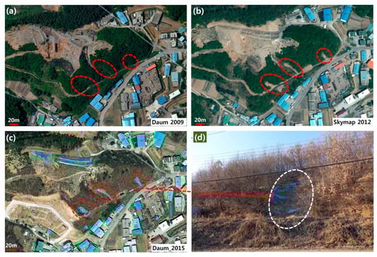 These types of photographs without ground control points (GCPs) can be freely obtained at portal sites such as DAUM [36] and Skymap [37] (“Skymap”) in Korea [38]. The eighteen photos (taken before and after the landslide events) were selected from each region of landslide occurrences and five GCPs were applied to each photo from digital topographic features using ArcMap 10.2. Three out of the 82 landslides detected from the visual interpretation of the photos are shown in Figure 3. The photos taken before and after landslide occurrences are shown in Figure 3a–c, respectively. Figure 3c,d shows the blue plastic-covered area to prevent soil flow after landslides, and Figure 3d was taken by field survey. Most of the intensive rainfall-triggered debris flows were approximately 10–70 m in length, 3–20 m in width range, and less than one m in depth.