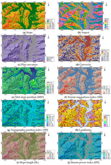 The extracted topographic factors were slope, aspect, plan curvature, convexity, topographic position index (TPI), terrain ruggedness index (TRI), min-slope position (MSP), and landforms (Figure 4a–h). The considered hydrologic factors were slope length (SL), stream power index (SPI), and topographic wetness index (TWI) (Figure 4i–k). Slope indicated the steepness of a hill, and aspect was the steepest downhill direction. Plan curvature was perpendicular to the slope and affects the divergence and convergence of flow across the surface. Terrain surface convexity was described as positive surface curvature and represented the percentage of convex-upward cells [43]. TPI was the difference between the elevation of each cell and the mean elevation for a neighborhood of cells [44]. Negative values represented lower features than surrounding features, values near zero were flat areas, and positive values represented features typically higher. TRI were absolute values obtained by squaring the difference between the value of a cell and neighbor cells, and convex and concave areas could have similar values. MSP were assigned a 0 value, while maximum vertical distances to the mid-slope in crest or valley directions were assigned a 1 value. Landform classification (cl 1: deeply incised streams, cl 2: shallow valleys, cl 3: upland drainages, cl 4: U-shape valleys, cl 5: plains, cl 6: open slopes, cl 7: upper slopes, cl8: local ridges, cl 9: mid-slope ridges, and cl 10: high ridges) was derived by ranges of TPI values [45]. SL was based on specific catchment areas and slope, with the former used as a substitute for slope length. SPI represented the erosive power of a water flow [46]. TWI indicated the effect of topography on the location of the saturated area size of runoff generation [46]. In general, higher SL and SPI, and lower TPI, represented a higher landslide susceptibility.