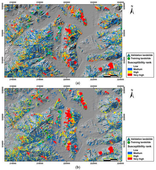 Landslide susceptibility maps based on (a) ANN; and (b) BT approaches. The rank was divided into four classes based on area: very high, high, medium, and low index ranges in 5%, 10%, 15%, and 70% of the study area, respectively.