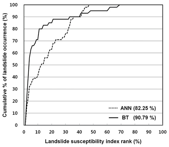 Susceptibility maps were verified and compared by using known 41 actual landslide events as a validation set that were not used in the ANN and BT training to evaluate whether they could effectively reflect future landslide hazard areas. The landslide susceptibility indexes were sorted in descending order, and divided by 100 classes with cumulative 1% intervals. The cumulative distributions of landslide occurrence were compared with receiver operating characteristics (ROC) curves in 100 classes [52]. The ANN and BT models had a reasonable performance of 82.25% and 90.79% as percentage of area under ROC curves, respectively (Figure 6).
