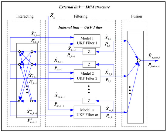The general IMM-UKF structure diagram, including models, is shown in Figure 1, where represents the unit delay link. The IMM-UKF can be divided to two parts: the external link-IMM structure and the internal link-UKF filter.