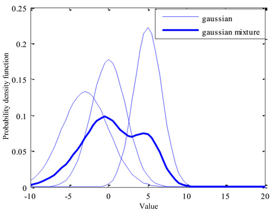For the external IMM-UKF links, is a weighted sum of Gaussian random variables and no longer obeys the pure Gaussian distribution because many peaks will exist in the probability density, which is similar to the probability density of the mixed Gaussian distribution [19]. The case when is scalar and is constant is explained in this section. It is assumed that is the weighted sum of three Gaussian random variables with normal distribution, and is the square root of , where , , . The probability density of the mixed Gaussian distribution is shown in Figure 2.