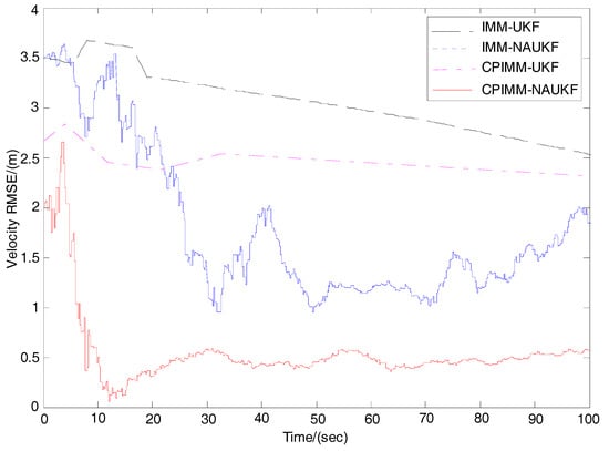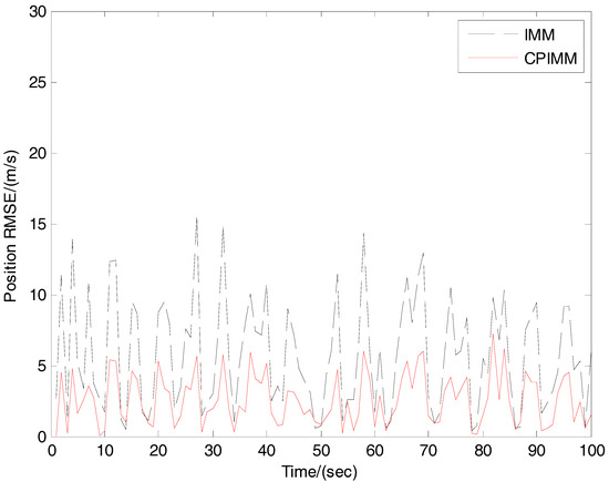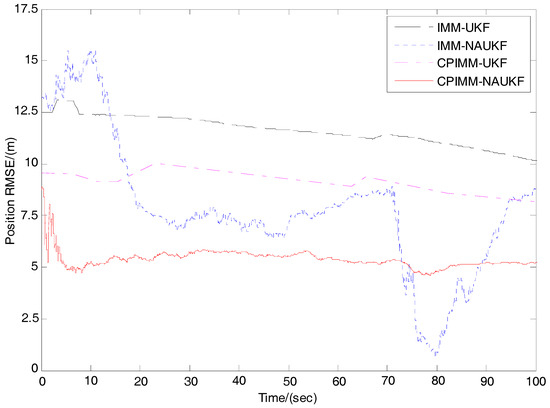 When the IMM and CPIMM methods are used, the target model description is the same as the numerical simulation. Four filtering methods including IMM-UKF, IMM-NAUKF, CPIMM-UKF, and CPIMM-NAUKF were used in the experiment, and these algorithms were evaluated by the estimation error shown by Equation (50).