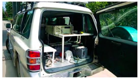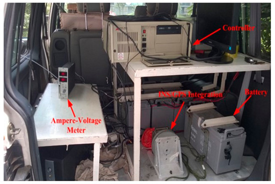 As shown in Figure 11 and Figure 12, the vehicle loaded integrated navigation system included a NV-IMU300 type INS, a JAVAD Lexon-GGD112T type GPS receiver, and a NovAtel DL-V3 GPS receiver on the vehicle, and another NovAtel DL-V3 GPS receiver was located at the Earth Reference Station. The working frequency of the GPS was 20 Hz. The maximum distance between the vehicle and the Earth Reference Station had to be less than 60 km, which ensured that the positioning precision of the vehicle was better than 0.1 m.