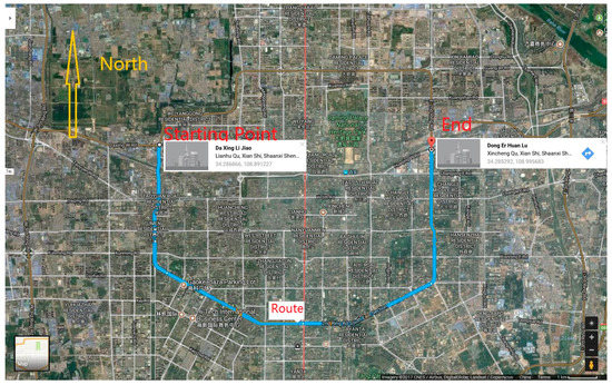 In the experiment process, the initial position was as follows: East longitude 108.891227°, North latitude 34.286866°, and an altitude of 437.92 m. Components of the velocity along the East, North, and Up directions were, respectively, −8 m/s, −35 m/s, and 0 m/s; the drift of the gyro was 0.12°/h, and the white noise was 0.02°/h; the bias of the accelerator was 10−3 g, and the white noise was 10−4 g; the positioning and position precision of the GPS were 5 m and 0.05 m/s; the other initial parameters were the same as the those described in the simulation section. The experiment test time was designed as 500 s with the sample period being 1 s, and the end point of the vehicle was East longitude 108.995683°, North latitude 34.285292°, and an altitude of 438.01 m. The practical road condition was the urban highway, and the real route of the vehicle is shown in Figure 13.