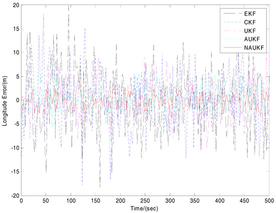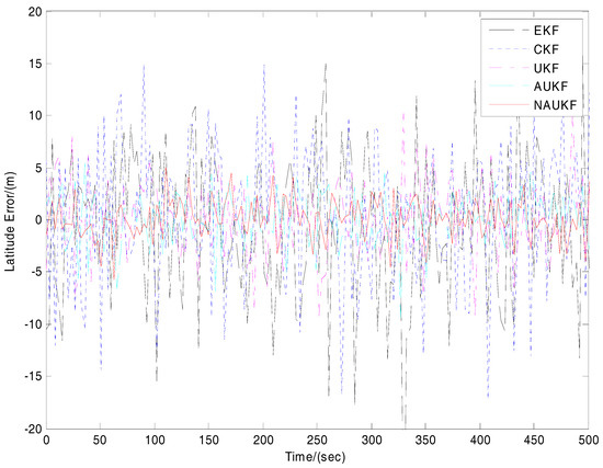 The comparisons of the longitude and latitude error curves of five filtering algorithms are shown in Figure 14 and Figure 15, and the corresponding statistical data of the mean absolute error are listed in Table 4. We can see that the EKF and CKF have almost the same filtering accuracy, although both EKF and CKF can deal with the nonlinear filtering problems—they only have first order accuracy. The filtering errors are, respectively, [−18.1025, 19.9471] m and [−17.5118, 18.4296] m of the longitude error ranging, and [−20.1143, 16.2477] m and [−17.4154, 14.9953] m of the latitude error ranging. The standard UKF has better filtering precision than does EKF and CKF, because UKF can reach third order accuracy, but it still has substantial oscillation and error due to the longitude error ranging [−11.0549, 10.2178] m and latitude error ranging [−9.1766, 9.9737] m. The AUKF has the adaptive ability of the imprecise noise in the urban complex environment, so it has better filtering accuracy than the UKF with the longitude error ranging [−5.8142, 6.0273] m and latitude error ranging [−8.1184, 6.4153] m. Ultimately, NAUKF has the best filtering accuracy, with the longitude error ranging [−4.1109, 4.3804] m and latitude error ranging [−6.1096, 4.7138] m, since it can not only adapt to the noise but also the sensor faults and model mismatches.