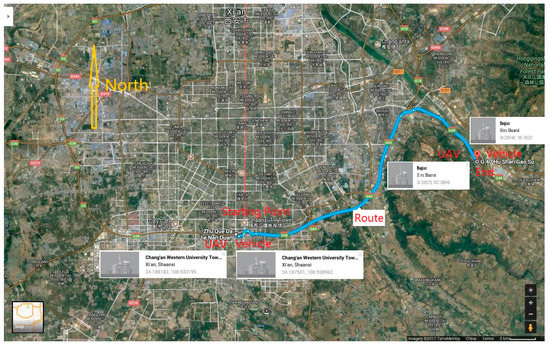 In the experiment process, both the pitch angle and azimuth measurement had the drift rate, and the distance measurement had the deviation for the SAR, but the precise statistics about the sensor faults and noises are still unknown. In Figure 18, the target vehicle is driving on the expressway, and the initial position of the UAV and the target vehicle is, respectively, East longitude 108.933195°, North latitude 34.188183°, and an altitude of 1.50 km and East longitude 108.938962°, North latitude 34.187501°, and an altitude of 436.05 m. The experiment test time is designed as 1000 s with the sample period being 1 s, and the end point of the UAV and the target vehicle is, respectively, East longitude 109.130943°, North latitude 34.245275°, and an altitude of 1.50 km and East longitude 108.145231°, North latitude 34.239740°, an altitude of 436.76 m.
