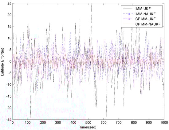 The comparisons of the longitude and latitude error curves of five filtering algorithms are shown in Figure 19 and Figure 20, and the corresponding statistical data of the mean absolute error are listed in Table 5. We can see that the standard IMM-UKF has the biggest filtering error with the longitude error ranging [−25.0223, 24.8762] m and latitude error ranging [−23.9917, 24.9834] m. The IMM-NAUKF has better filtering precision than IMM-UKF because of the adaptive ability to the sensor faults with the longitude error ranging [−16.1849, 14.0871] m and latitude error ranging [−13.8628, 14.0563] m. The CPIMM-UKF has better filtering precision than IMM-UKF because of the adaptive ability to the non-Gaussian distribution with the longitude error ranging [−10.0547, 14.2482] m and latitude error ranging [−14.7196, 12.2544] m. The CPIMM-NAUKF has the best filtering accuracy, since it can not only adapt to the non-Gaussian but also the sensor faults and model mismatches with the longitude error ranging [−5.0018, 6.8623] m and latitude error ranging [−4.8007, 4.9106] m.