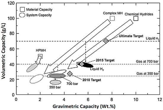 Metal hydrides can be categorized into different types including AB5 (LaNi5), AB2 (ZrV2), AB (FeTi), and A2B (Mg2Ni) based on their chemical composition. Among all these types, AB2 and AB5 are the best known metal hydrides to absorb hydrogen. The AB2 family of metal hydrides have an excellent hydrogen capacity (up to over 7 wt %) but have unacceptably slow kinetics of hydrogenation and dehydrogenation, even after extensive activation at 673 K (400 °C). The AB5 group has an excellent hydrogenation performance at ambient temperatures but poor hydrogen capacity typically in the range of 1–1.5 wt % []. Metal hydrides useful for on-board hydrogen storage and can be broadly categorized as: (1) complex metal hydrides (e.g., NaAlH4) that have low hydriding pressures (20–150 bar), relatively high hydriding temperatures (200–300 °C), and high volumetric capacities; and (2) high pressure metal hydrides (HPMH) that have high hydriding pressures and hydriding temperatures lower than 100 °C but have a low volumetric capacity (2–3 wt %) [,,]. Both these types of metal hydrides require additional mechanisms such as external cooling, high pressure cylinders, etc., that increase the overall system weight and hence the reduced system capacity. In addition, carbon-based physisorption materials such as CNTs and MOFs show very high material storage capacities at low temperatures (77 K and 50–100 bar), and their hydrogen absorption capacity greatly decreases with an increase in temperatures [,]. Figure 2 shows the shows volumetric and gravimetric capacities of various storage materials and compares them to the best-known system capacities using these materials.