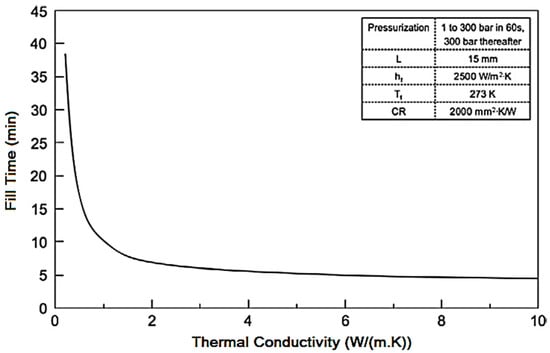 In practical applications, the rate of the hydrogen absorption/desorption reaction is often limited by how quickly heat can be added to, or removed from, the hydride as opposed to the intrinsic kinetics of hydriding and dehydriding [,]. While metal hydrides are basically alloys with good thermal conductivity, they break down into micron size particles after a few hydrogenation/dehydrogenation cycles in a hydrogen system. As a result, thermal conductivity is greatly affected and decreases significantly; typically, the thermal conductivity is around 1 W/(m·K) for metal hydrides [,]. In addition, when hydrogen is introduced into a hydride bed, its atoms fill the pores in the bed and result in even lower conduction rates. The decreased rate of heat transfer in a bed will eventually result in extended hydriding times []. Figure 3 shows the effect of the thermal conductivity of the bed on its fill time. It can be observed that for the typical thermal conductivity of metal hydrides, i.e., 1 W/(m·K), the fill time is significantly higher and can be reduced if the thermal conductivity can be at least doubled.