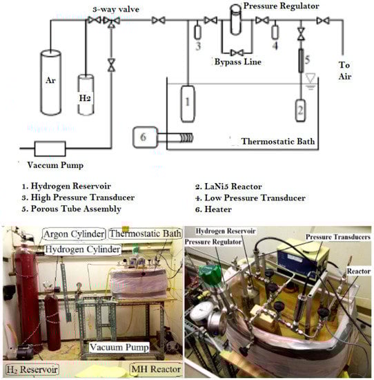 The experimental device and its schematic is shown in Figure 4. The experimental setup consists of an argon cylinder and a hydrogen cylinder with a vacuum pump and hydrogen storing section. Argon is implemented to provide the required inert atmosphere for LaNi5 when there are no experiments running. Hydrogen cylinder provides Ultra High Purity (UHP hydrogen of 99.999% purity) level for experiments. Both argon and hydrogen cylinders are connected to the rest of setup through a single pipe. Also, a vacuum pump provides a vacuum in connecting lines and a hydrogen storage section. The reactor is made of Stainless Steel containing 171 g of a LaNi5 powder activated by successive absorption/desorption cycles. The particle size is about 60 μm and the porosity is about 0.5.
