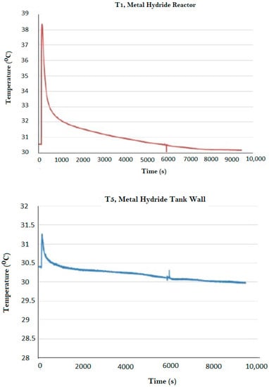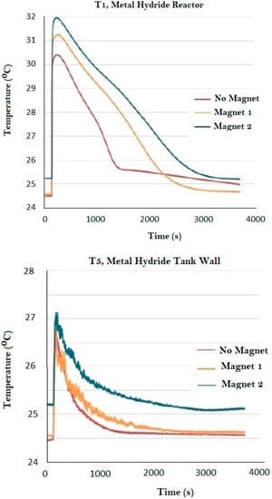 Considering that experimental results supported heat transfer enhancement in the LaNi5 bed under magnetism, a set of experiments were run to check the hydrogen absorption properties of lanthanum nickel under magnetism. In these experiments, magnets 1 and 2 are used to provide magnetic fields inside the reactor. Initially, experiments were done to check the amount of hydrogen absorption in the bed without any magnetic fields, and then two series of experiments with magnets 1 and 2 were performed. Temperature distributions of two sample experiments during the hydriding process inside the reactor and on its wall are illustrated in Figure 6.