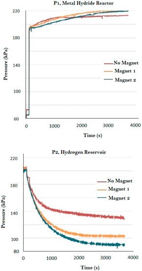 Measured pressures in the reactor and reservoir are presented in Figure 7. From the final pressures in the reactor as shown in Figure 7, at the end of data recording time the equilibrium pressure of reaction experiences a slight increase. Also, the rate of decrease in pressure of the reservoir shows that the time required to absorb an identical amount of hydrogen in each case is decreased by implementing magnetic fields. Thus, applying magnetic fields enhances hydrogen absorption time in a LaNi5 bed. It is postulated that the variation in equilibrium pressure and temperature is because of the decreased permeability and increased heat transfer area in the system, due to the compaction of particles when magnets are present.