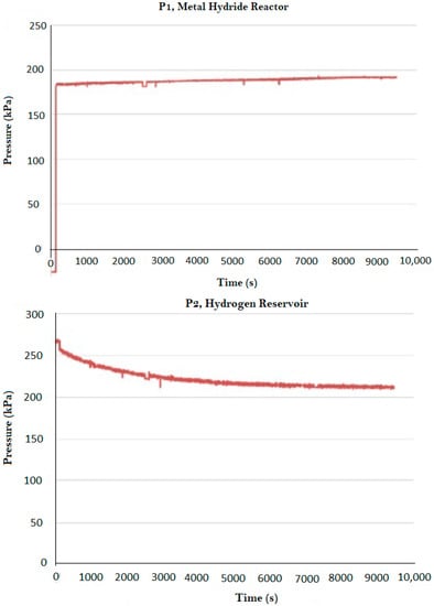 For the absorption test, initially, the hydrogen tank is charged at the desired pressure and was kept in contact with the metal hydride reactor. The hydrogen pressure inside the tank decreases until it reaches a stable value. Because the absorption reaction is exothermic, the hydride bed is cooled by using water coming from a thermostatic bath.