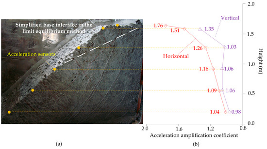 - As the inputting acceleration (horizontal direction) increased to 0.8 g, the sliding surface propagated to nearly go through the crest area and some cracks parallel to the sliding surface were observed in the slope (Figure 6a).