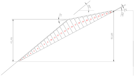 - Reach the basic geometric parameters ψb, ψp, ψs, ψd, ψf and ∆x from in- situ measurement work and calculating other geometric parameters a1, a2, b, yn, Mn and Ln according to Equations (A1)–(A11).