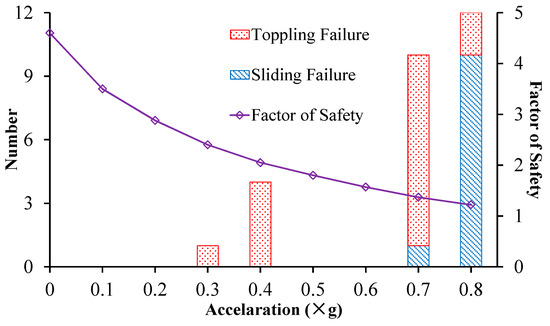 - As the accelerations (both horizontal and vertical direction) increased to 0.3 g, two toppling blocks were estimated (Table 4b).