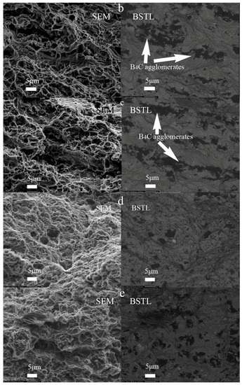 Figure 10 shows the SEM and the concomitant BSE images (BSTL) of the typical fracture surface of the specimens. For the sintered pure Al sample (Figure 10a), multiple shallow dimples with an average diameter of 0.8 μm are observed, which are formed by the joining of micro voids along shear slip bands. On the contrary, although the stress-strain curves of the B4C-Al composites indicates apparent brittle fracture in a macroscopic scale without apparent necking (see Figure 7), the fracture surface morphology observed from SEM shows a ductile nature in microscopic scale with fine dimples of ~0.5 μm (Figure 10b–e). Addition of the B4C reinforced particles reduces the macroscopic ductility, which can be verified from the formation of smaller dimples compared to those without addition of B4C. The particle-matrix de-cohesion resulting dimples are observed, indicating that the tensile fracture of the composites is controlled by void nucleation and growth [1,25].