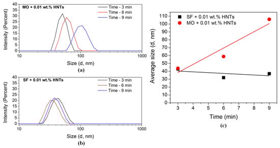 (a) Hydrodynamic size distribution of HNTs over time for MO + 0.01 wt. % HNT; (b) Hydrodynamic size distribution of HNTs over time for SF + 0.01 wt. % HNTs; (c) Average HNTs hydrodynamic diameter over time comparison for MO + 0.01 wt. % HNTs and SF + 0.01 wt. % HNTs. Lower stability is found for MO nanofluids.