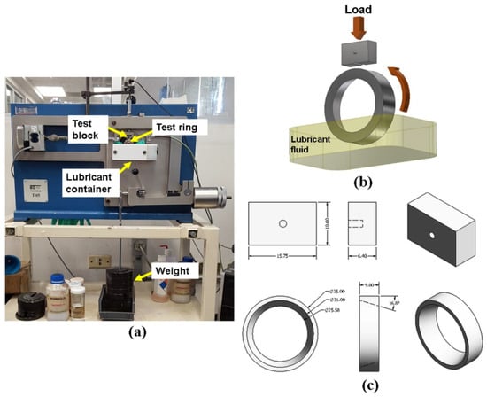 Tribological characterization of nanofluids was performed with a T-05 block-on-ring tribotester shown in Figure 3a, according to ASTM G77. The schematic of the block-on-ring configuration used for this study indicating the direction of the applied load is shown in Figure 3b. Figure 3c shows the dimensions of test block and ring samples.