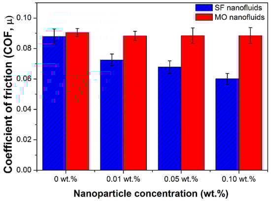 Coefficient of friction values for MO and SF nanofluids with varying HNT nanoparticle concentration.
