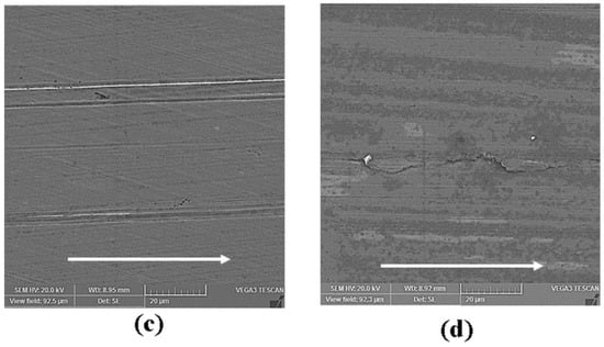 Scanning electron micrographs after tribological testing of: (a) SF; (b) SF + 0.01 wt. % HNTs; (c) SF + 0.05 wt. % HNTs; (d) SF + 0.10 wt. % HNTs. Arrows indicate the direction of sliding.
