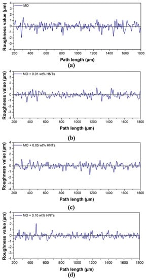 Roughness profiles and Ra values of worn blocks for MO + HNT nanofluidos: (a) MO, (b) MO + 0.01 wt. % HNTs, (c) MO + 0.05 wt. % HNTs, (d) MO + 0.10 wt. % HNTs.