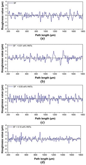 Figure 8 with SF nanofluids presents overall smoother surfaces compared to MO nanofluids (Figure 7). Figure 8a (unfilled SF) shows very few regions with pitting and shallow furrows. Lower groove density with increasing HNT concentration is evident in Figure 8b–d, with a very smooth surface found with 0.10 wt. % HNTs.