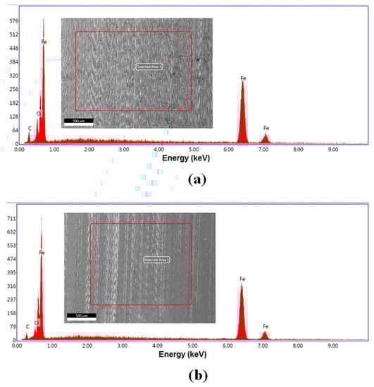Elemental analysis performed by EDS on the worn blocks tested with MO + 0.10 wt. % HNTs and SF + 0.10 wt. % HNTs can be observed in Figure 11a,b, respectively. No Al and/or Si elements were detected on the surface, suggesting that at the contact pressure of this test of 0.5 GPa there was no HNT deposition and formation of a protective film. Furthermore, nanoparticles were too large to fill valleys or grooves of surfaces and provide a mending tribological mechanism.