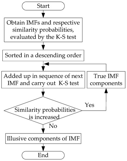 As a consequence of both the upper and lower envelopes identified by means of extrema interpolation, illusive components are seen in IMFs in the course of an EMD decomposition. It is hence postulated that the HTT accuracy can be upgraded in case all the illusive components can be identified and filtered out in an effective manner. Underlain by a K-S test, an iterative decision criterion is proposed in this work to address the threshold value problem as put forward by the authors of [17]. Subsequent to the EMD decomposition, n number of IMFs are gained and respective similarity probabilities, evaluated by the K-S test, sorted in a descending order, are added up in sequence. In the case of true IMF components, a cumulative similarity probability between the added up and the original signals is seen toward unity. If this is not the case, a decreasing trend of the similarity probability is deemed as the case of illusive components. This decision criterion is made to identify each IMF as either an illusive or a true component, that is, each IMF, not containing the intrinsic physical meaning of a partial discharge signal, is treated as an illusive component, and vice versa. Demonstrated in Figure 2 is a criterion flow chart of the illusive component decision.