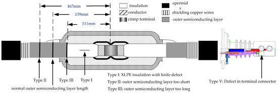 Statistics in the literature indicate that a high proportion of the cross-linked polyethylene (XLPE) power cable breakdowns occur in cable joints [18,19]. The experimental objects in this study were 25 kV XLPE power cable joints. Figure 4 shows the possible defect models that may be caused by humans during power cable joint construction. This study simulates an insulation defect caused by a knife when the worker peeled the insulation shield. The defect depth is 2 mm and length is 20 mm in insulation, defined as XLPE insulation with a knife defect (Type I). In our experiment, the normal length of the insulation shield to the conductor terminal should be cut to 139 mm, with ±10% being an acceptable range. We simulated that worker cut to 167 mm, which is 20% more than the normal length, and was defined as the insulation shield being too short (Type II). Another simulated insulation shield cut only 111 mm, which is 20% less than the normal length, and was defined as the insulation shield being too long (Type III). A healthy power cable joint (Type IV). Defect in cable terminal connector (Type V). Finally, a healthy terminal connector (Type VI).