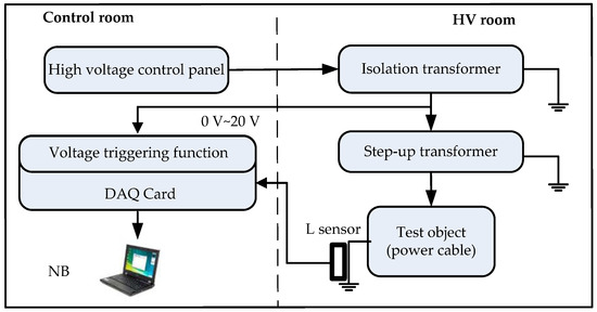 Figure 5 shows a block diagram of the PD experiment in the laboratory. Construction of the PD experiment laboratory included a notebook (NB), high voltage control panel, an isolation transformer, a step-up transformer, test objects (power cable), a data acquisition (DAQ) card and a high-frequency inductive sensor (L sensor) to measure the electrical signal caused by the PD phenomenon in power cable. This experiment used the positive edge trigger function of the DAQ card to acquire the output voltage of the isolation transformer as the trigger signal. The electrical signals recorded by the L sensor were all synchronized in each experimental model.