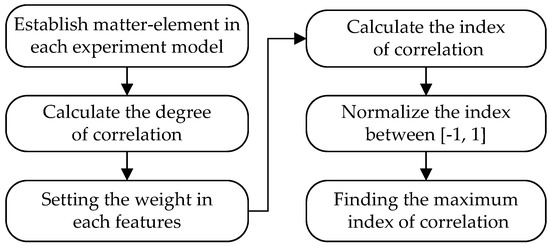 Step 7: Find the maximum normalized correlation index (or 1). In the case of λk = 1, then the tested model is categorized to the kth defect type. The flow chart of the recognition method based on extension theory is shown in Figure 8.