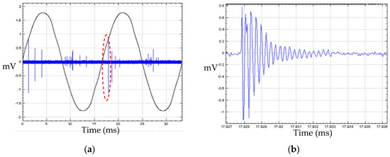 Partial discharge signal. (a) PD signal in sin wave. (b) One PD pulse.