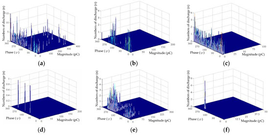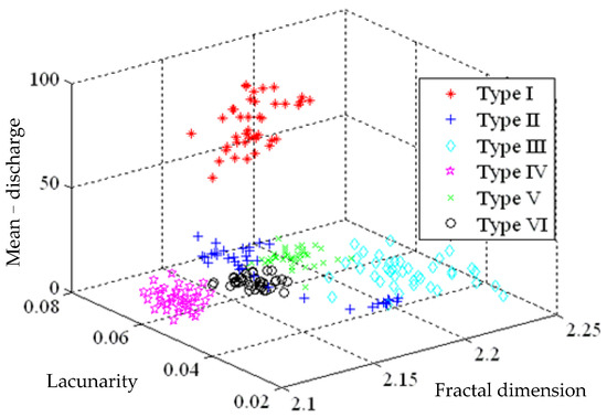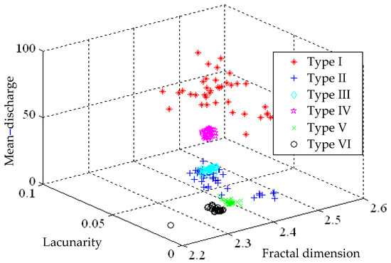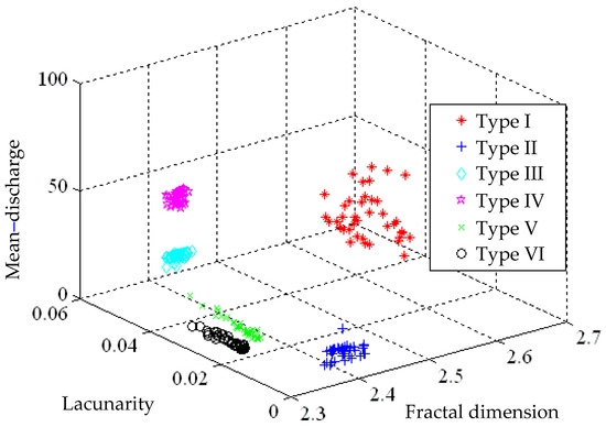 For further improving the recognition rates of IHHT, additional PD features extracted from phase-resolved 3D patterns are taken into account. The detailed procedure of feature extraction from a phase-resolved 3D pattern can refer to authors’ previous research [26]. The measured PD field data are first transferred to n-q-φ 3D pattern, and the fractal features and mean-discharge are then extracted from the phase-resolved 3D patterns. Figure 15 shows the typical 3D patterns as transferred from the measured PD data for each experiment model. The parameters of the 3D patterns are number of discharge n, discharge magnitude q, and phase angle φ. We can observe that the amplitude (pC) and numbers of discharge (n) in Type IV and VI are less than the other defect types. In Type I, the discharge amplitude is larger than that in the other defects, the maxima discharge can even reach 350 pC. The experiment Type II and Type V have the similar 3D pattern but discharge amplitude Type V is larger than Type II. According to the 3D PD pattern in each experiment model, we found that the features are different between the defect models. Demonstrated in Figure 16 are the features distributions of the fractal dimension, lacunarity and mean-discharge extract from 3D phase-resolved PD pattern. The patterns belonging to a particular class are close to each other, and the distribution of Type I is very clearly different with other modes. The recognition rates of combining IHHT with phase-resolved n-q-φ 3D PD pattern are shows in Table 4. There are totally seven features as input to extension method for pattern recognition. It can be obviously observed that combining IHHT with phase-resolved PD pattern not only improves recognition rates but also enhances noise tolerance. It can reach 83% even when ±30% noise is added.