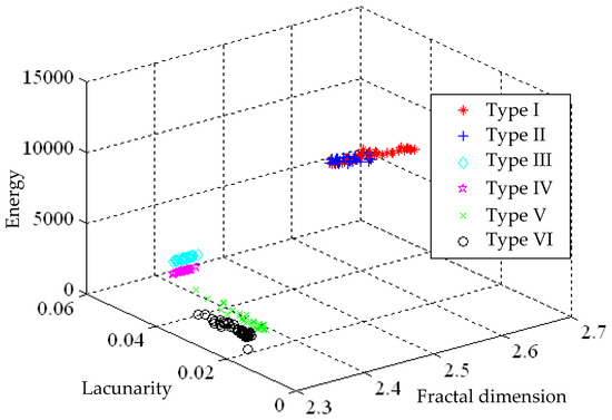 With the z axis representing the signal energy, presented in Figure 10 are time-frequency-energy 3D spectrums, converted from 10 MHz of Hilbert spectrum as well as a 16 ms time duration, written into a matrix of dimension 256 × 1024. Both the fractal dimension (FD) and lacunarity (Λ) are extracted out of such 3D spectrums, after which the Mean-discharged (M), the 3rd feature, is extracted to plot the distribution as Figure 11. It is noted that there is a significant variation among various feature distributions, but the variation tends to vanish as the effect of mode confusions stemming from illusive components, between similar defect modes, i.e., Types II and III. As tabulated in Table 1, the identification ratio of Type III ranks the lowest place, an evidence that illusive components demonstrate highly negative effect on the identification result.