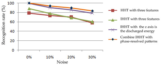 As illustrated in Figure 17, a relatively high identification result is provided by IHHT in contrast with HHT as a consequence of the removal of mode confusions, purification of IMFs and features extracted by a fractal theory. Due to the fact that a partial discharge signal is sensed as an extremely weak signal, the marginal difference in 3D spectrums analyzed by both HHT and IHHT is not distinctive enough unless the features are extracted in IHHT by a fractal theorem. This research also combines IHHT with phase-resolved 3D patterns for further improving recognition rates. The results show that more representative features added can effectively raise the recognition rates. However, more complex procedure for both features extraction and pattern recognition are comparatively required.